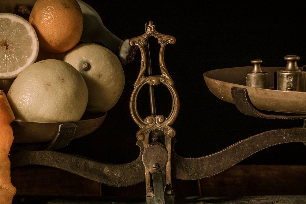 A nice quiet life of fruit, in a retro setting, the scales and weights are from around 1900.