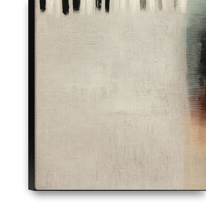 Silent Line is a hushed, minimalist painting in which a row of small, abstract figures moves along the horizon. In the background, soft grey and sand tones merge with a vertical band of colour in teal, deep black and warm reddish brown. The subtle texture and many "empty" areas give the work a calm, almost meditative…