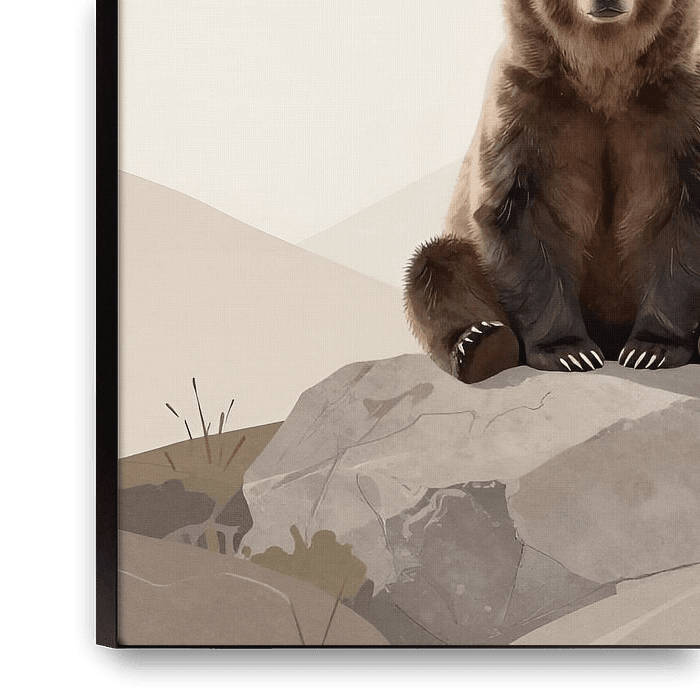 A mighty brown bear sits calmly on a rock. The soft, sand-coloured hills and the clear composition give the motif a timeless, meditative effect. The bear does not appear threatening, but dignified and centred – a symbol of inner strength, calmness and self-confidence. The image combines a connection to nature with modern…
