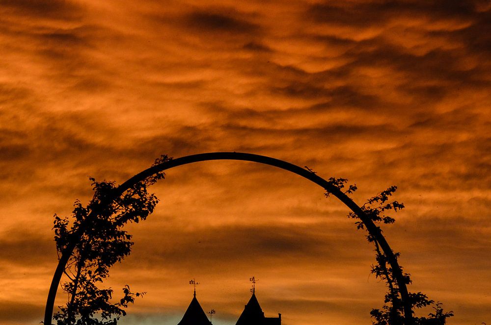 Slot Assumburg, Heemskerk onder een prachtige oranje kleurende lucht door de onder gaande zon.