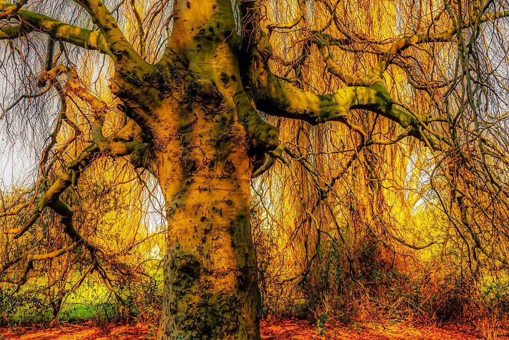 About "Silhouette hanging beech tree trunk and branches bare in spring"