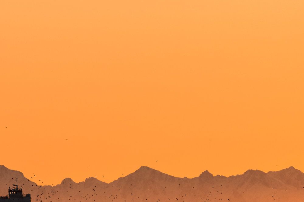 A fishing boat stands out as a silhouette against the deep orange sunset. The mountains in the background are the island of Andoya of the Vesteralen, near the Lofoten in northern Norway.