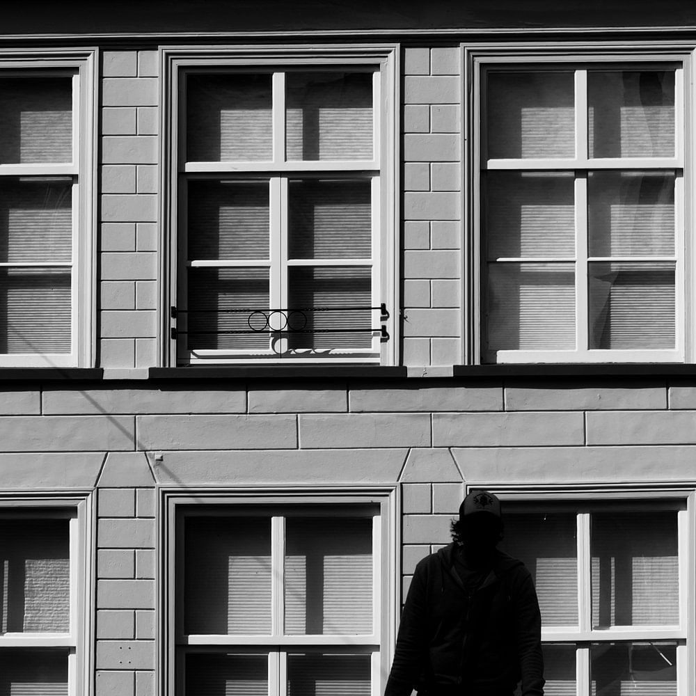 Last summer, I visited the exhibition "Lothar Wolleh sees Jan Schoonhoven" at museum De Prinsenhof in Delft. This was my first introduction to the work of Lothar Wolleh (1930-1979). Wolleh is best known for his characterful portraits of avant-garde artists from the 1960s. His pictures, taken with a Hasselblad camera, are always square, in black and white and with a thick black border. Also characteristic of his work is the use of strong contrasts. Wolleh was a friend of Delft artist Jan Schoonhoven and regularly visited him in his home town Delft. The portraits Wolleh made of Schoonhoven in Delft are the subject of an exhibition in De Prinsenhof. The exhibition gave me the idea of making a series of photographs of Delft, inspired by the portraits of Jan Schoonhoven that Lothar Wolleh made in Delft. Instead of portraits, I made street photos with casual passers-by as walk-ons. In this photo, you see a man with a shopping bag crossing a bridge. As the hard midday sun shines on the bright house on Oude Delft and the man walks in shadow, only his silhouette is visible.