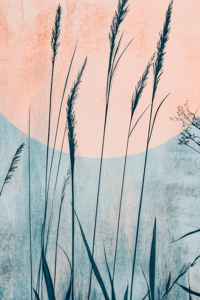 Gentle silhouettes of delicate grasses and flowers play around the calming presence of a large, shimmering full moon. The soft, blue and rose-coloured tones lend the room a peaceful atmosphere. This artwork harmonises perfectly in the bedroom or living room and immediately creates an inviting, relaxing mood.
