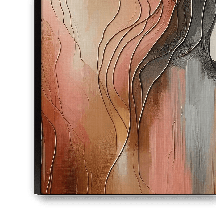 Indulge in the mystique and elegance of this abstract oil painting of a female silhouette, rendered in warm browns, pinks and golds. The figure's flowing contours blend harmoniously with the background, with deep brown tones creating a sense of warmth and depth. Soft pink tones add a touch of femininity and softness, while gold accents subtly light up, bringing the whole picture to life. This modern, dreamy piece exudes sophistication and is perfect for those who want to enrich their interiors with a unique, timeless creation full of symbolism and beauty.