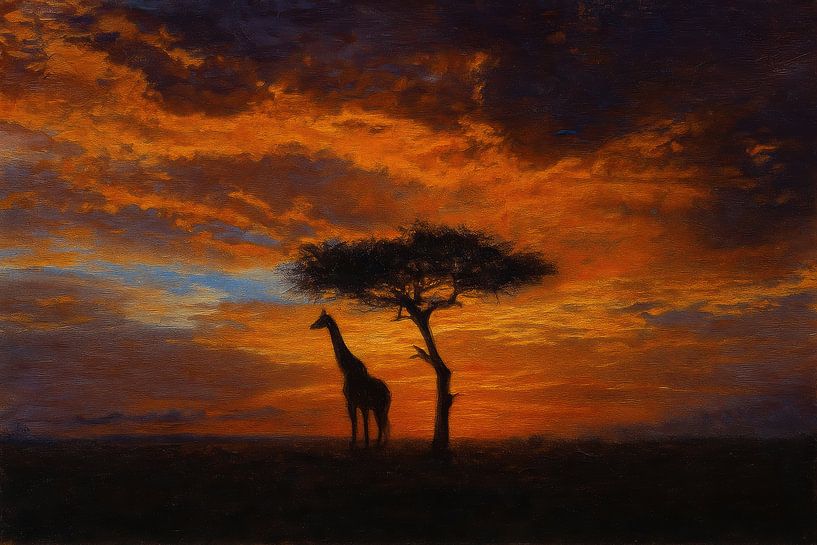 A tall giraffe stands silhouetted next to a lone acacia tree, sharply outlined against a fiery sky. Undulating clouds in red and purple fill the air, while a dark horizon emphasises the depth. The slender tree crown forms an elegant counterpoint to the animal's long neck. Warm tones flow into cool shadows, creating a calm, contemplative…