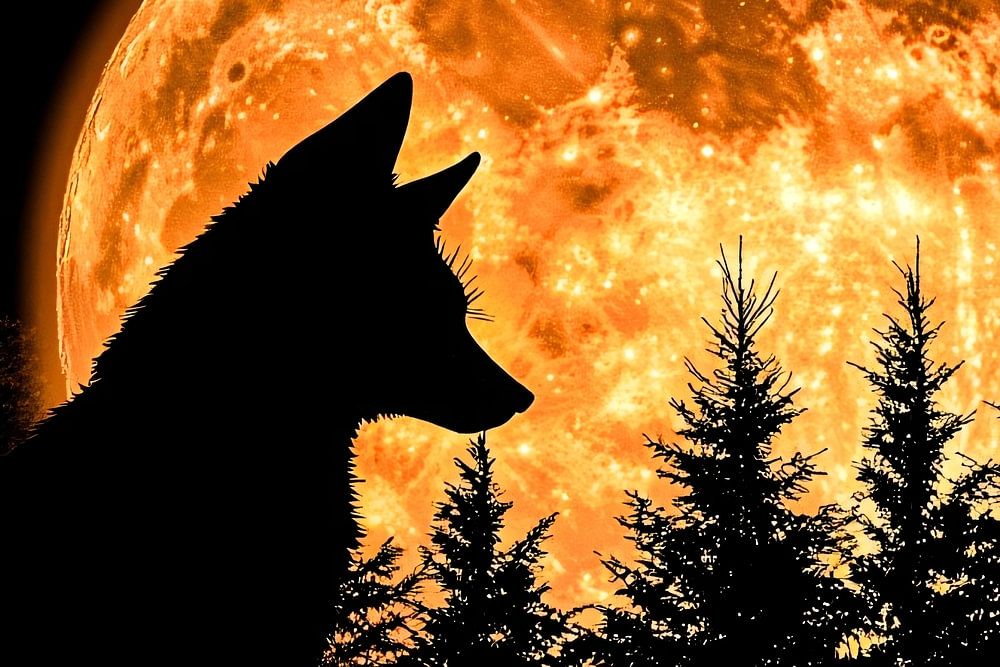 This striking design combines the majestic silhouette of a wolf with the dramatic background of a glowing full moon. The warm hues of the moonlight contrast beautifully with the dark silhouettes of the wolf and trees. Perfect for a modern space or a rustic bedroom, this artwork exudes mystery and natural beauty. The timeless design speaks to nature lovers and lovers of minimalist art alike. It is an impressive eye-catcher that transforms any wall into an atmosphere of magic and elegance.