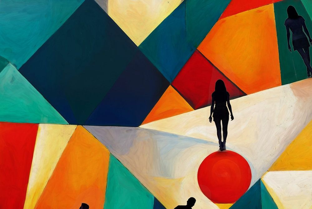 The composition consists of a background filled with sharp geometric shapes and a broad spectrum of colours. The human figures, represented as dark silhouettes, seem to float and navigate through this colourful abstraction. This creates an intriguing contrast and emphasises the anonymity and diversity of individuals in a larger picture.