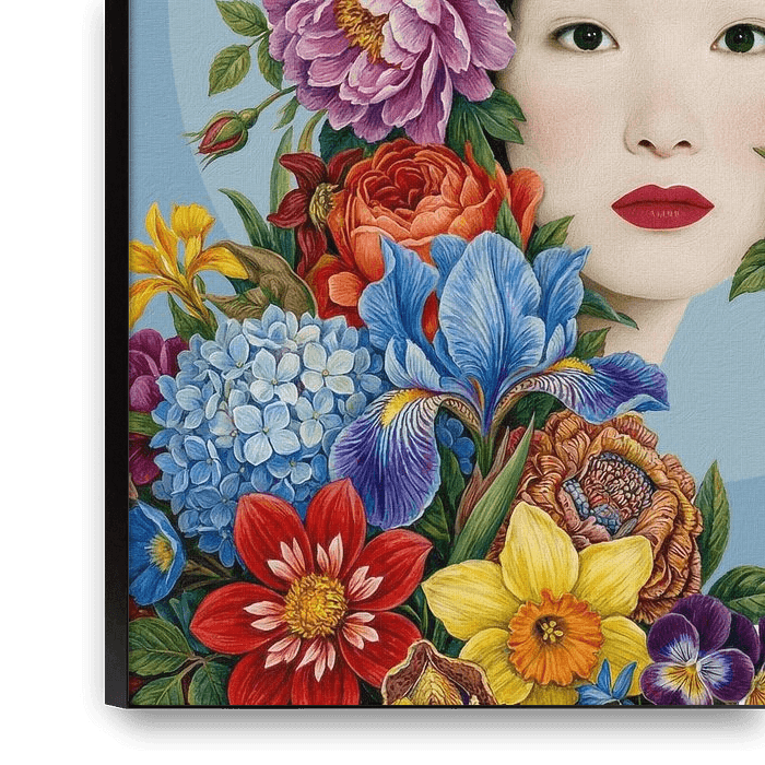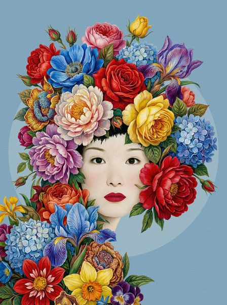 This colourful and expressive artwork shows a woman whose face is partially hidden by an exuberant bouquet of vibrant flowers, such as roses, peonies and irises.