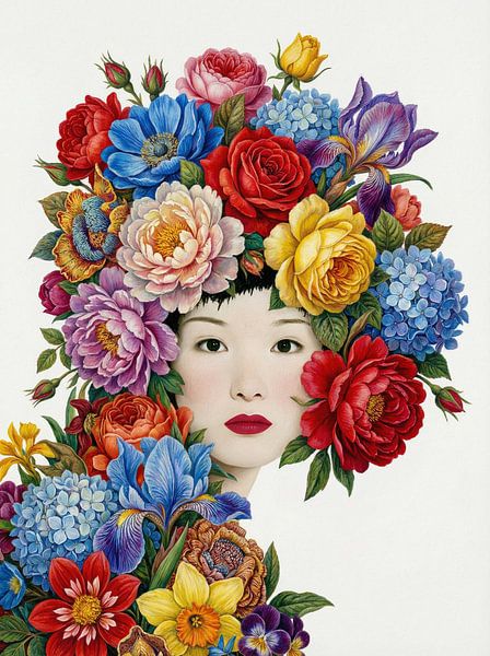 This colourful and expressive artwork shows a woman whose face is partially hidden by an exuberant bouquet of vibrant flowers, such as roses, peonies and irises.