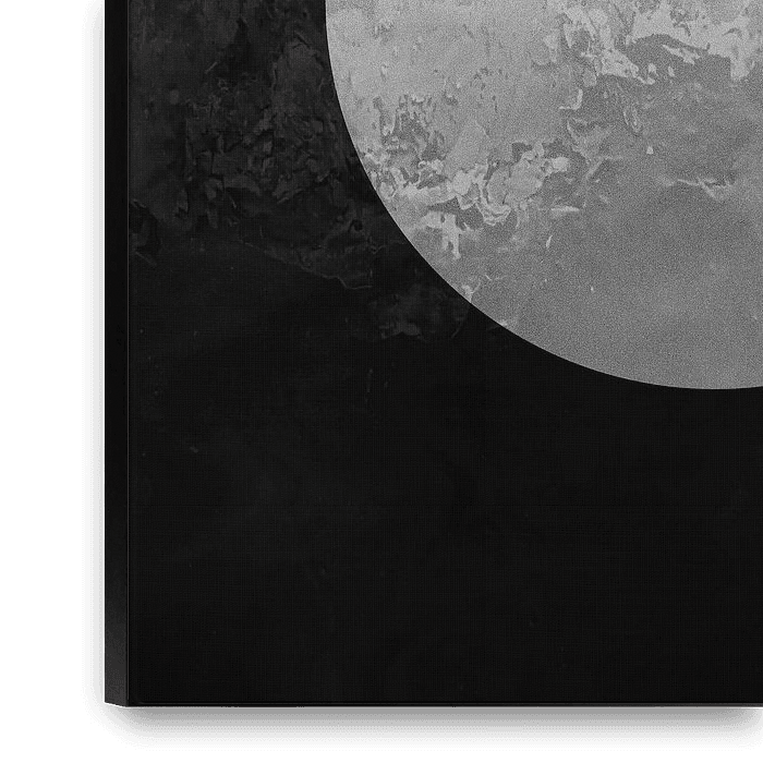 An abstract but minimal painting of a mother-of-pearl golden moon in monochromatic colours of silver, ivory, black, grey and others.