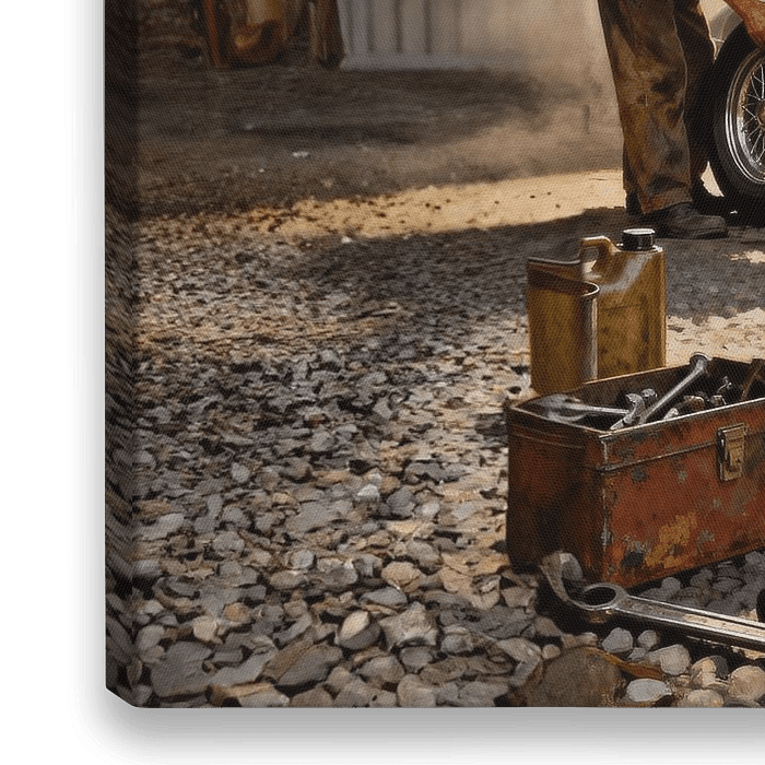 The image captures a silver vintage Porsche 911 parked in a rustic, atmospheric garage. Gleaming with a polished finish, the car commands attention with its iconic round headlights and wire wheels. The right front corner is propped up by a weathered orange hydraulic jack, while a mechanic, clad in brown workwear and a flat cap, crouches…