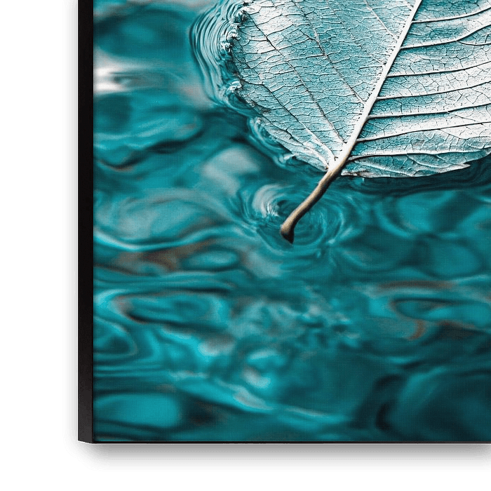 This beautiful design shows a detailed leaf with silver veins gently floating on a water surface. The contrast between the leaf and the wavy, teal-blue background gives a serene and calming look. Perfect as an artwork for modern interiors, adding a calming element. Capturing a moment of pure natural beauty, this design offers a timeless aesthetic that suits a variety of styles. The interplay of light and texture makes it a real eye-catcher.