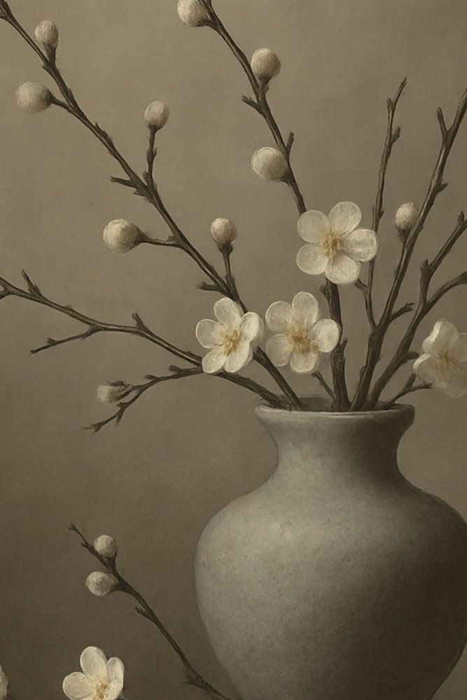 An understated still life with a cement-grey vase filled with delicate white blossom branches. The soft grey tones and subtle light create a sophisticated, serene look. The combination of tranquillity, minimalism and natural elegance makes this artwork suitable for both modern and classic interiors. The texture of the vase and the simplicity of the composition create a timeless, harmonious atmosphere on the wall.