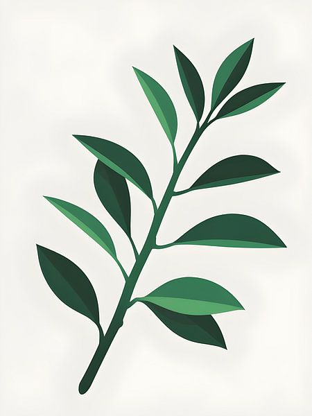A clean, elegant illustration of a single botanical stem with alternating lance-shaped leaves in layered green tones. The minimalist design showcases natural leaf arrangement with subtle dimensional shading. Ideal for modern botanical prints, eco-friendly branding, natural product packaging, spa decor, wellness materials, or…