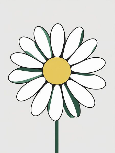 A cheerful, graphic illustration of a classic white daisy with clean white petals radiating from a bright yellow center, outlined in black for bold definition. The straightforward design on a light background captures the flower's innocent charm and timeless appeal. Ideal for summer themes, children's decor, retro designs, simple floral…
