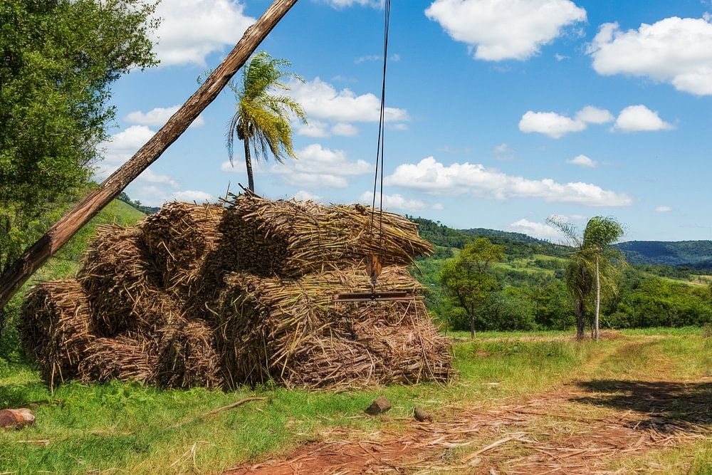 Simple crane device for loading sugar cane onto trucks in Paraguay.