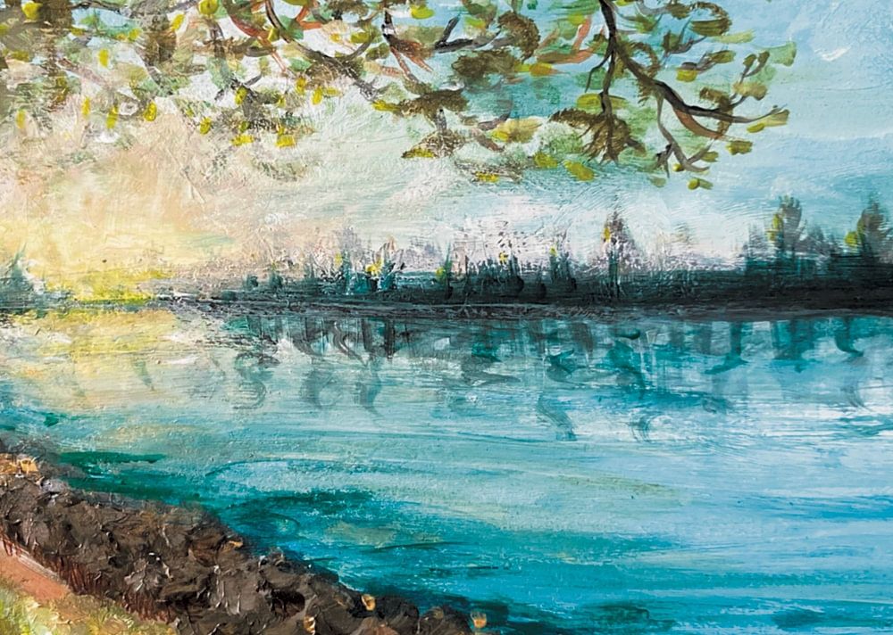 The sun rises on adriaan volkersingel in Sliedrecht, South Holland, Netherlands. It is early in the morning and the golden yellow sun shines over river Merwede. The trees and bushes on the other side are still shrouded in a dark silhouette , and the dark blue sky is slowly lighting up. The sun's rays reach the leaves, trees, grass and rocks lying by the water. Spring is coming. This painting is originally painted with acrylic paint on canvas. Beautiful landscape art for you as a lover of painting or nature, and definitely an asset for Sliedrecht art lovers.