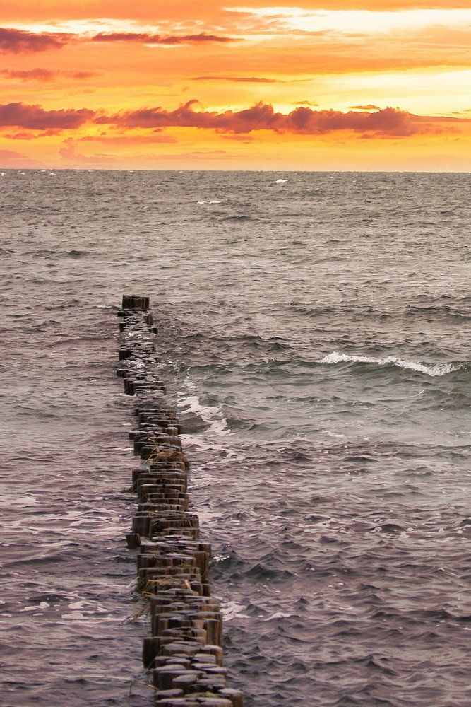 Groyne in Zingst on the Baltic Sea. Individual groynes. Landscape photograph. Taken on the coast