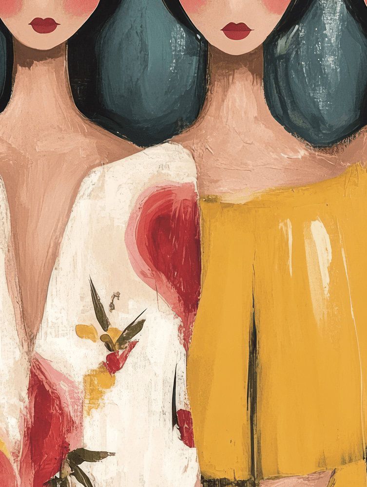 Three women, connected in silence and colour. With their soft gazes, summer dresses and a touch of mystery, this work exudes warmth, elegance and connection. The combination of deep greens, sunny yellows and floral details makes this painting an atmospheric eye-catcher that fills any room with softness and style.