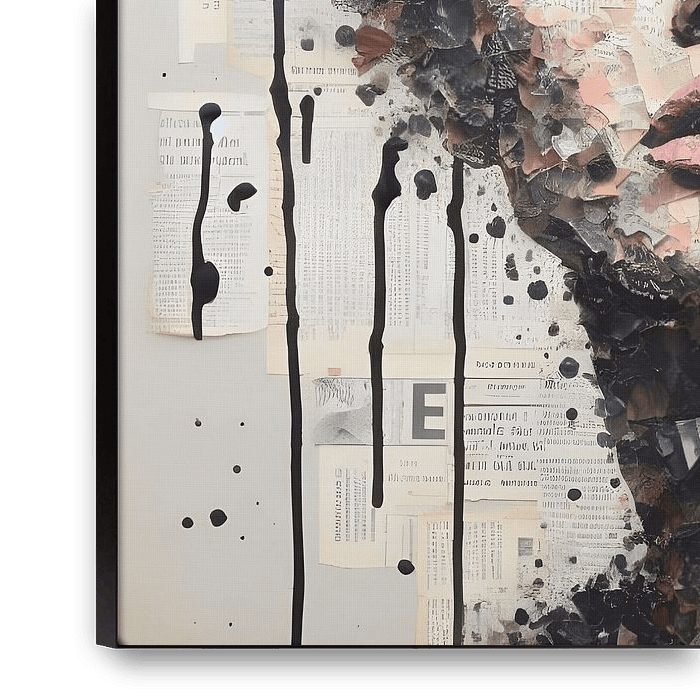 The combination of (paint) stains, splatters and drips and digital (post)processing produces a work that has both a spontaneous, robust and expressive character and a graphic, detailed, contemporary look.