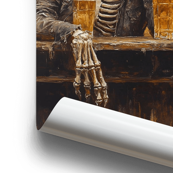 Two skeleton cowboys sit at the bar, their bony hands wrapped around a cold beer. With their worn-out hats and tattered leather jackets, they exude a laid-back coolness. The rustic bar atmosphere, filled with warm, earthy tones, evokes a sense of nostalgia, adventure, and timeless camaraderie.