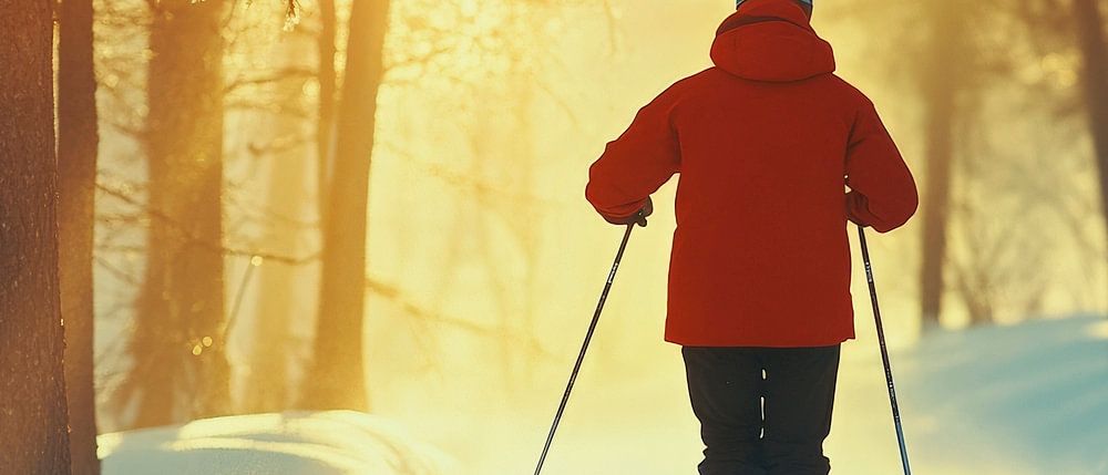 A lone skier crosses the glistening white landscapes of a snow-covered forest, while the sun glistens gently between the trees. This wintry impression brings peace and adventure at the same time and is perfect for the living room, where it can enrich every moment of relaxation as a reminder of the beauty of nature.