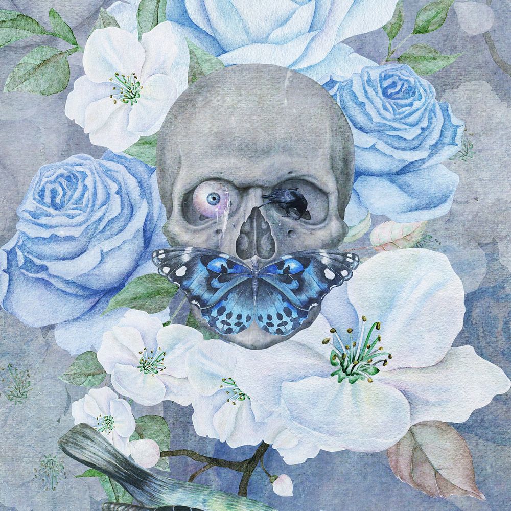 Buy this butterfly art Skull and Blue Tit by Lucia on canvas, ArtFrame, poster and wallpaper, printed on demand in high quality.