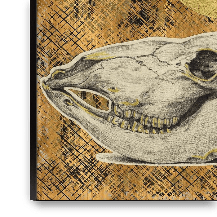 Skull of a cow by Jean Bernard, 1816, reworked and placed on a contemporary background. Newspaper strips, showing a collage of paint strokes, sharp shapes and gold details.