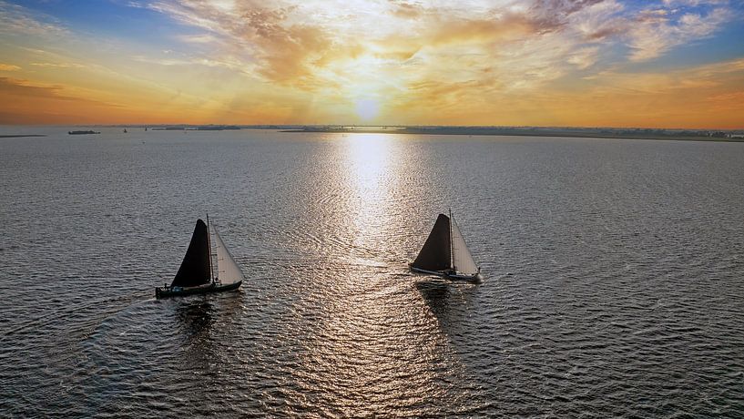 During sunset, traditional skûtsjes sail across the Heegermeer, where sails, water and light combine to form a powerful and recognisable Frisian image.