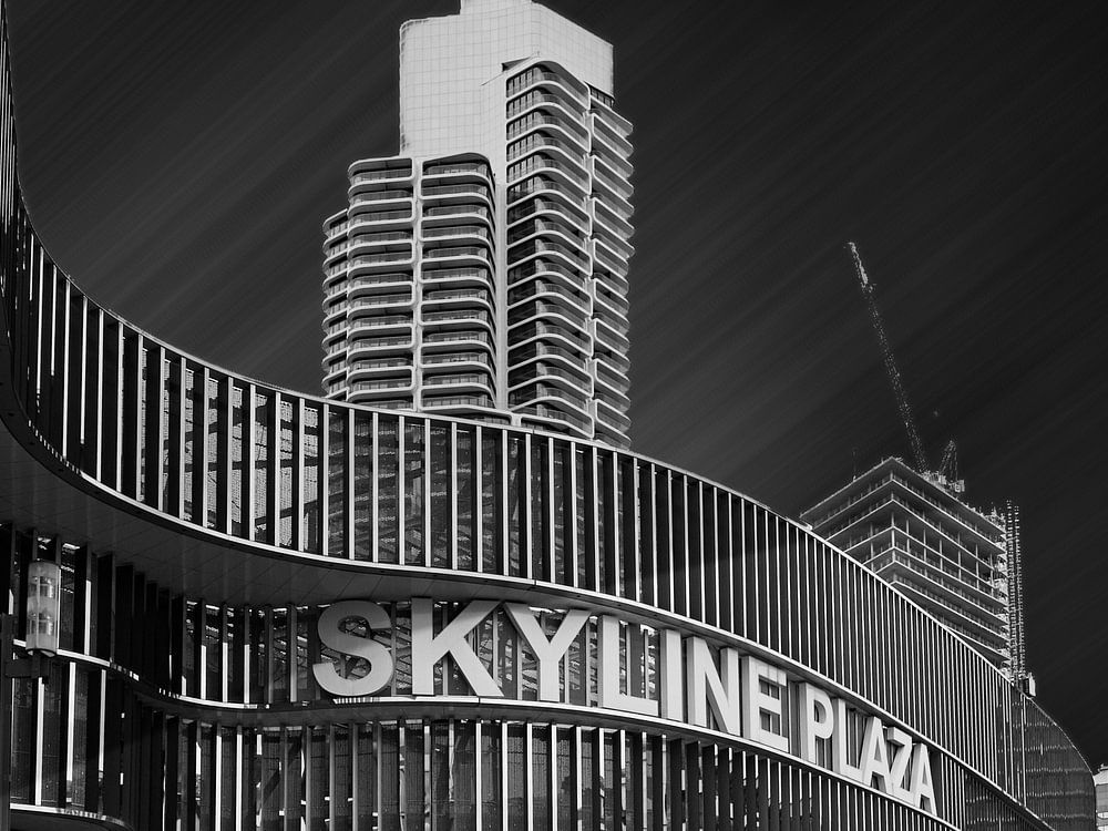 Black-and-white architectural shot of the modern city centre of Frankfurt am Main.