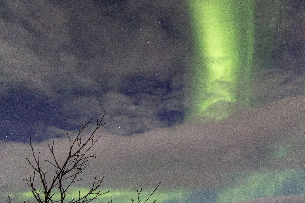The Aurora Borealis is not just a natural wonder here, but an experience that goes beyond the visible. The green glow flows like a river through the starry sky, caught between the snow and the night. Trees and hills stand out in the foreground - silent, snow-covered, almost reverent under the arc of light. Even faint stars can be recognised - framed by the intense glow.