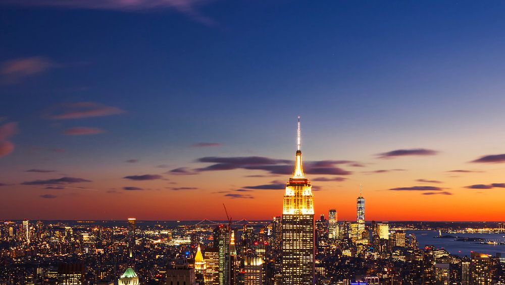 Skyline of New York, USA with Empire State Building and other skyscrapers seen from Top of the Rock on the roof of Rockefeller Center. The photo was taken at dusk just after sunset. New York is located in the United States of America and is one of the most influential cities in the world.
