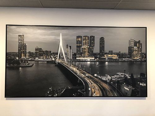 With this photo you will bring a pearl into your home. The typical Rotterdam skyline is determined by, among other things, the Maastoren (highest office building of the BeNeLux), the Erasmus Bridge, De Rotterdam, Montevideo, Cruise Terminal, Hotel New York, etc., etc.