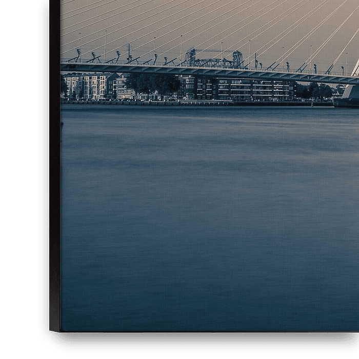 vanaf de Maasoever heb je een schitterend uitzicht op de skyline van Rotterdam. De Erasmusbrug, De Rotterdam van Koolhaas, bepalen het beeld van dit stukje Rotterdam. De foto is in de avond gemaakt met de ondergaande zon op de brug en de gebouwen. De afwerking in duotone geel en blauw geeft een speciale sfeer.