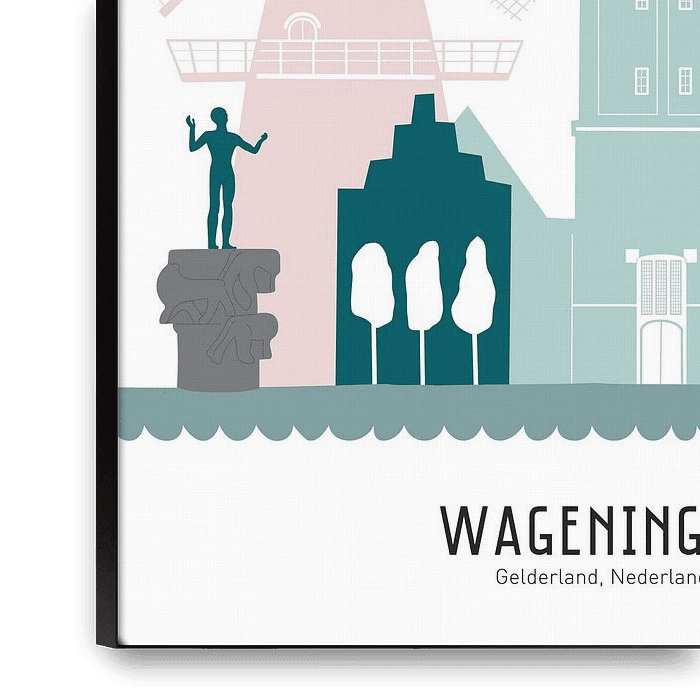 Buy this illustration Skyline illustration Wageningen in colour by Mevrouw Emmer on canvas, ArtFrame, poster and wallpaper, printed on demand in high quality.