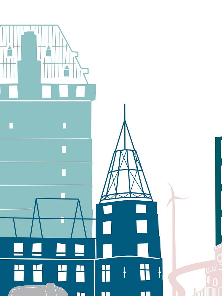 Skyline illustration city of Almere in colour by Mevrouw Emmer