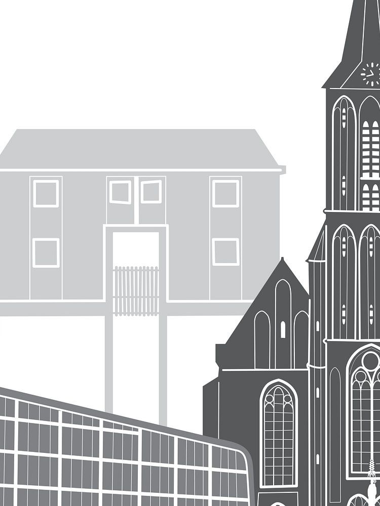 Buy this illustration Skyline illustration city of Hengelo in black-and-white-grey by Mevrouw Emmer on canvas, ArtFrame, poster and wallpaper, printed on demand in high quality.