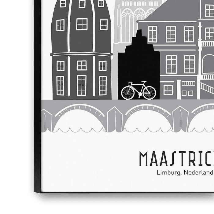 Buy this illustration Skyline illustration city of Maastricht black-and-white-grey by Mevrouw Emmer on canvas, ArtFrame, poster and wallpaper, printed on demand in high quality.