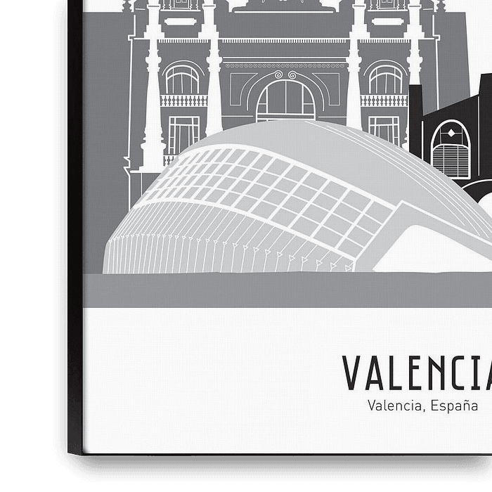 Buy this illustration Skyline illustration city of Valencia, Spain in black-and-white-grey by Mevrouw Emmer on canvas, ArtFrame, poster and wallpaper, printed on demand in high quality.