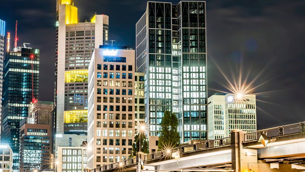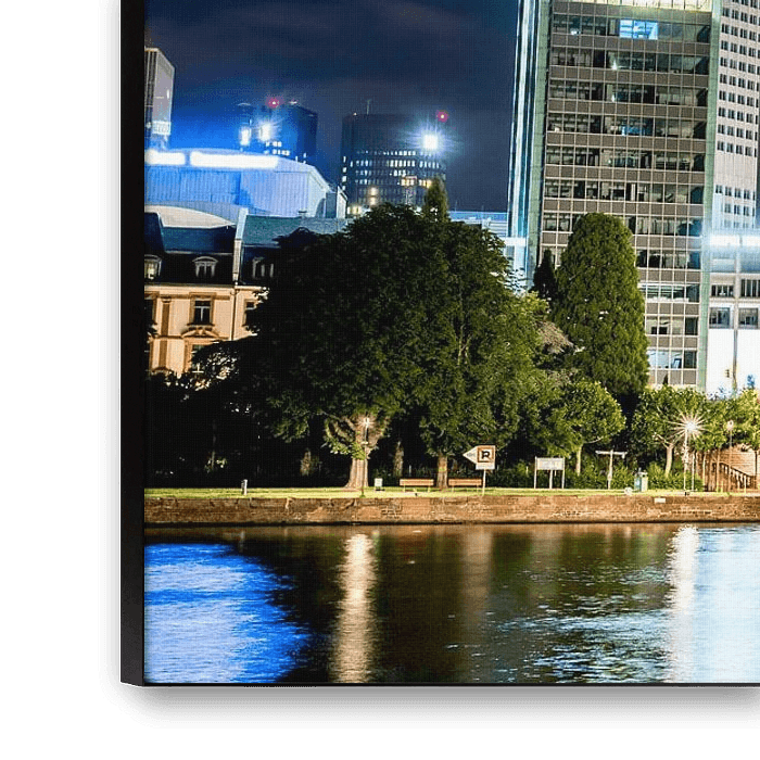Buy the photo Skyline of Frankfurt at night by Günter Albers on canvas, ArtFrame, poster and wallpaper, printed on demand in high quality.