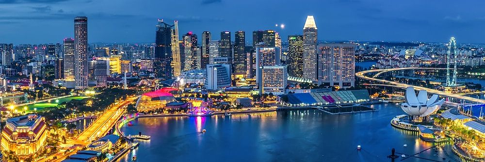 This blue hour panorama of Marina Bay in Singapore was taken from a viewing platform on the west side of Marina Bay. On the left are the houses of the skyline and on the right the imposing building of the famous Marina Bay Sands Hotel. The panoramic photo was created from six portrait shots and was later put together on the computer. Any modern office would be lucky to have this marvellous panorama in a conference room.