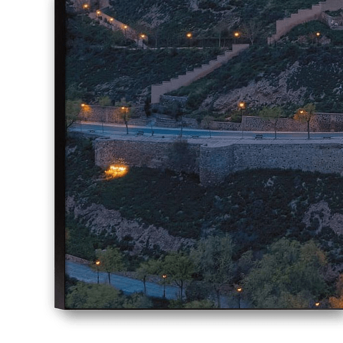 An evening during sunset with the view from Mirador Panoramico of the Cathedral and Alcazar of Toledo, a stone fortress located at the highest point of the Spanish city of Toledo.