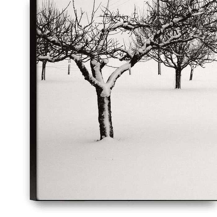 Photograph of a wintry landscape - an orchard with trees in minimalist-style in black and white.