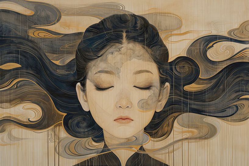 Het tweede, even opvallende element is het haar — een zee van donkere, sierlijke stromen die zich als inkt in water door het beeld bewegen. De haarpartij is geen realistisch haar maar een compositie van golvende lijnen, krulpatronen en dunne gouden accenten die met een bijna muzikale ritmiek over het doek trekken. Die haarlijnen brengen beweging en ritme in het schilderij en contrasteren bewust met het stille gezicht; zo ontstaat die typische spanning tussen aanwezigheid en verbeelding. De gouden lijntjes en de lichte druppelstrepen die van boven naar beneden lopen, geven een gevoel van tijdelijkheid en gelaagdheid, alsof gedachten langzaam afdruipen.