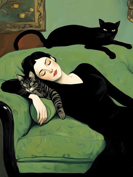 Buy this portrait Sleeping Woman with Cats by IamHome Studio on canvas, ArtFrame, poster and wallpaper, printed on demand in high quality.