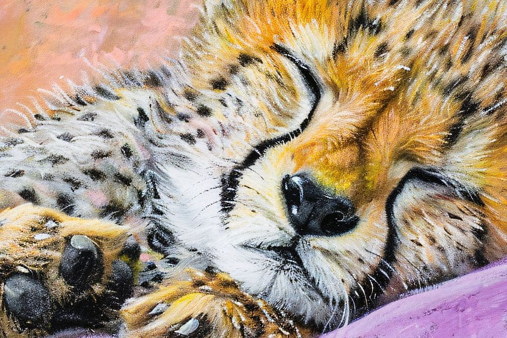 This beautiful painting depicts a sleeping cheetah in a surrealist style. The vibrant colours and use of abstract background elements give the work a unique look that attracts attention. Perfect for lovers of animal art and surrealist art movements. The soft purple of the blanket contrasts beautifully with the warm orange and yellow of the cheetah, creating a sense of calm and warmth. This piece would be a great addition to any room that needs a touch of colour and originality. Hang it in a bedroom or hobby room for a relaxing and inspiring atmosphere.