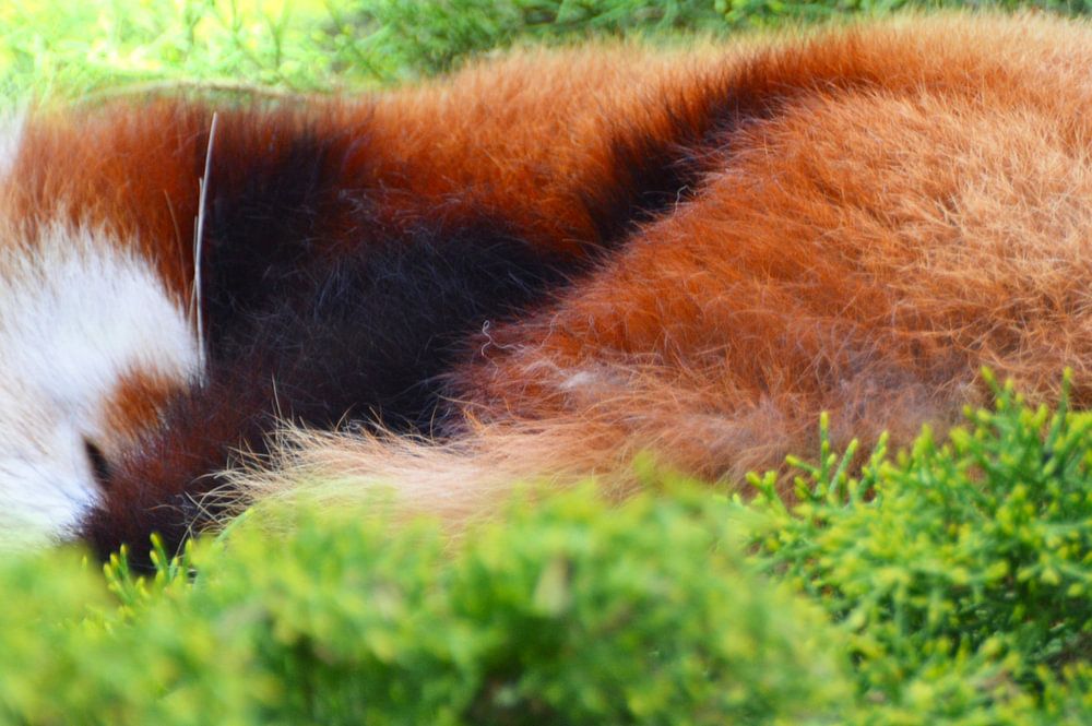 This little red panda (Ailurus vulgens) was in deep rest, sleeping among the greenery.