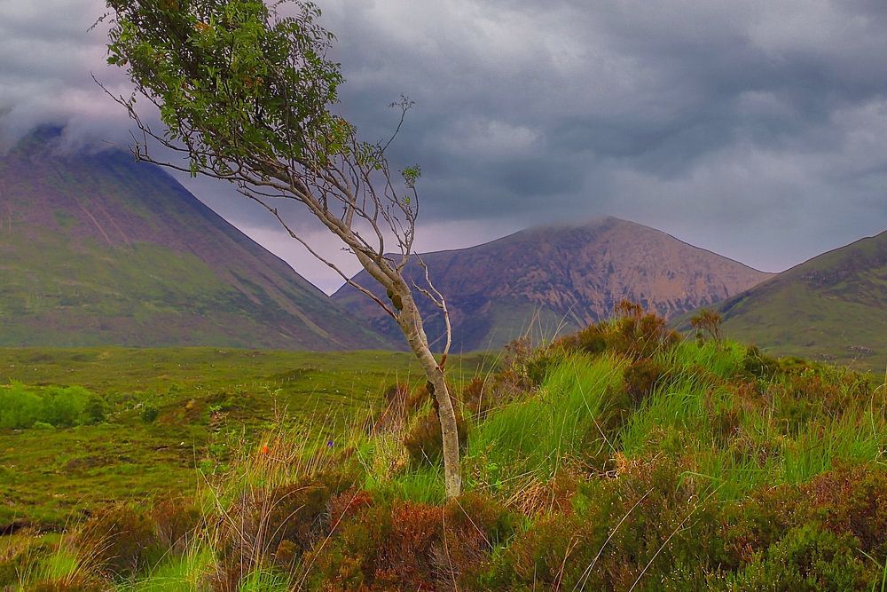 A tree blows in the wind in the breathtaking Highland landscape near Sligachan Bridge.