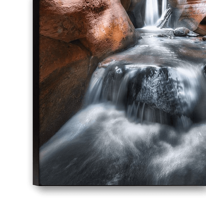 Canyon in Utah near Zion National Park in the southwest of the United States of America. View through the slot canyon of Kanarra Creek with small waterfall and beautiful river course. This beautiful slot canyon is not far from the famous Narrows. A longer hike through the riverbed of the canyon leads to three small waterfalls at the end, one of which is shown here. Portrait / portrait picture.